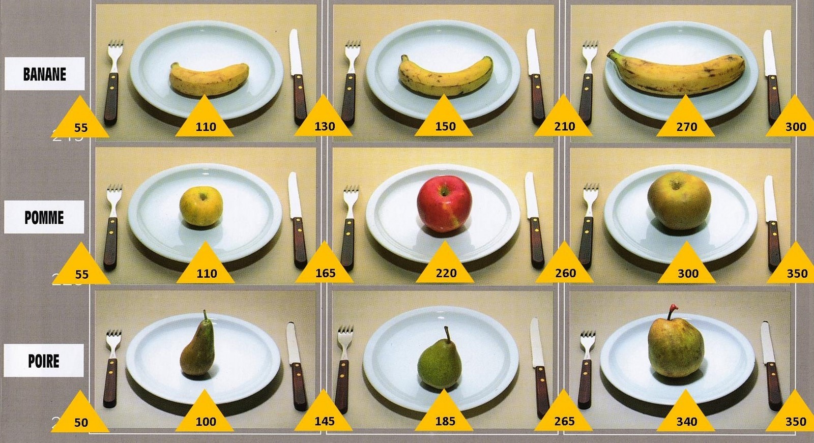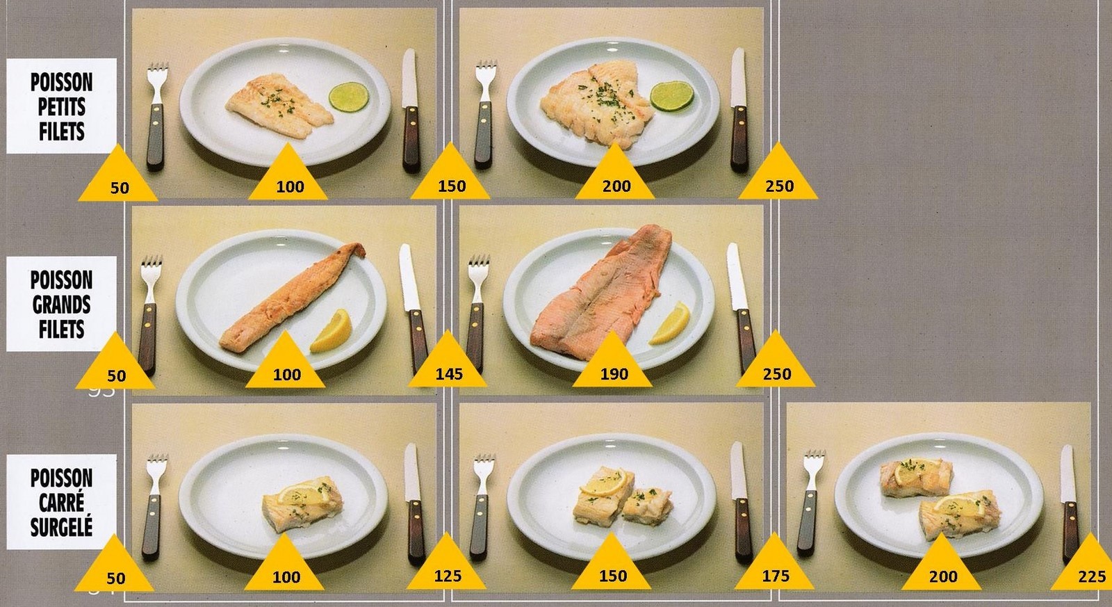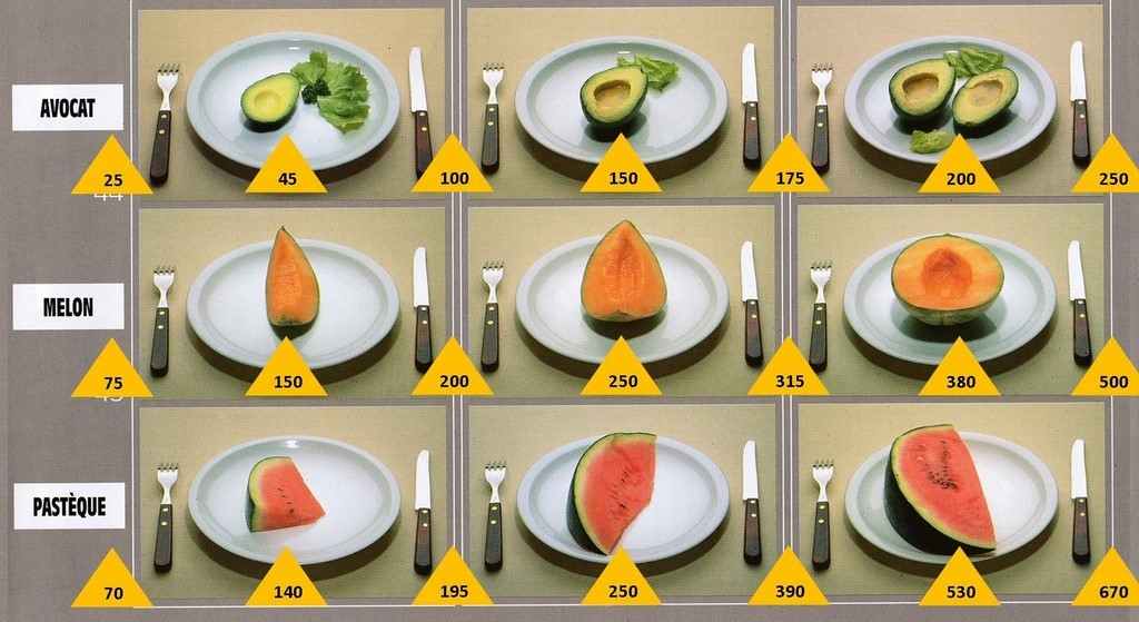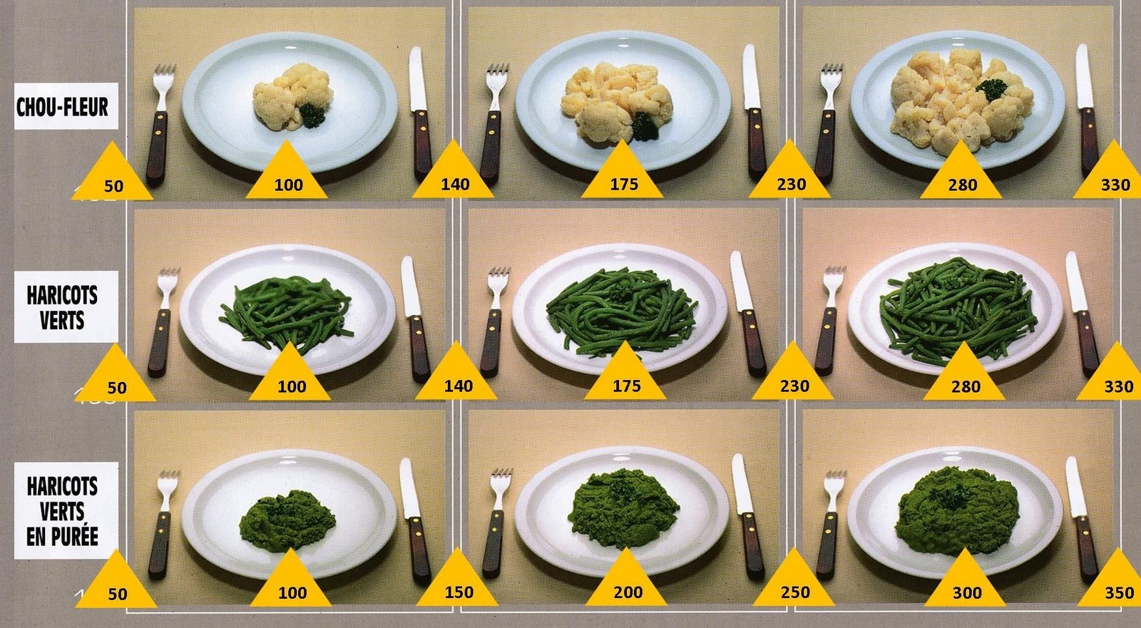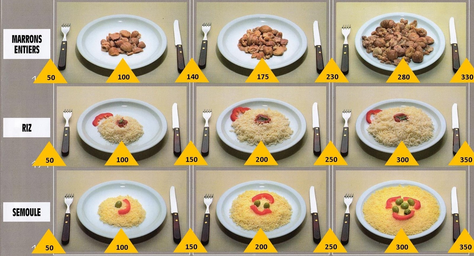 Le poids des aliments est noté dans les triangles jaunes, en grammes pour les aliments solides,