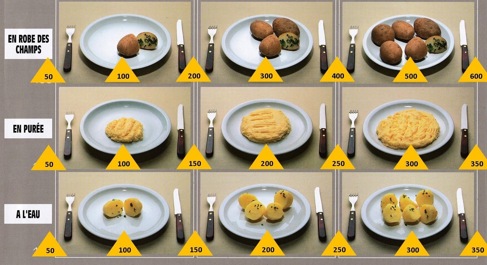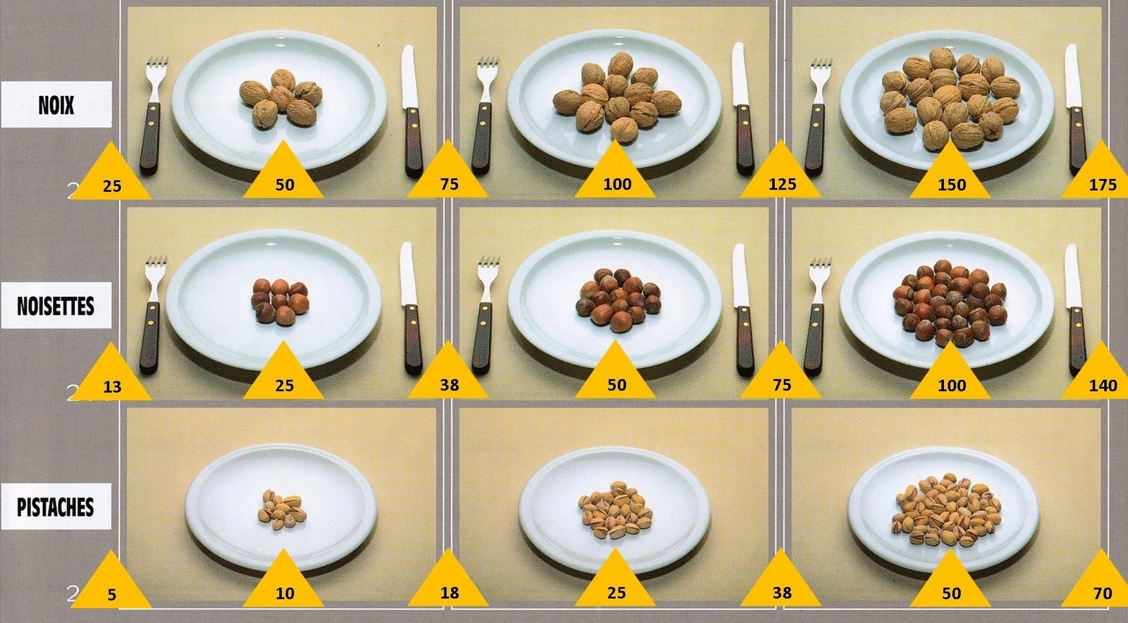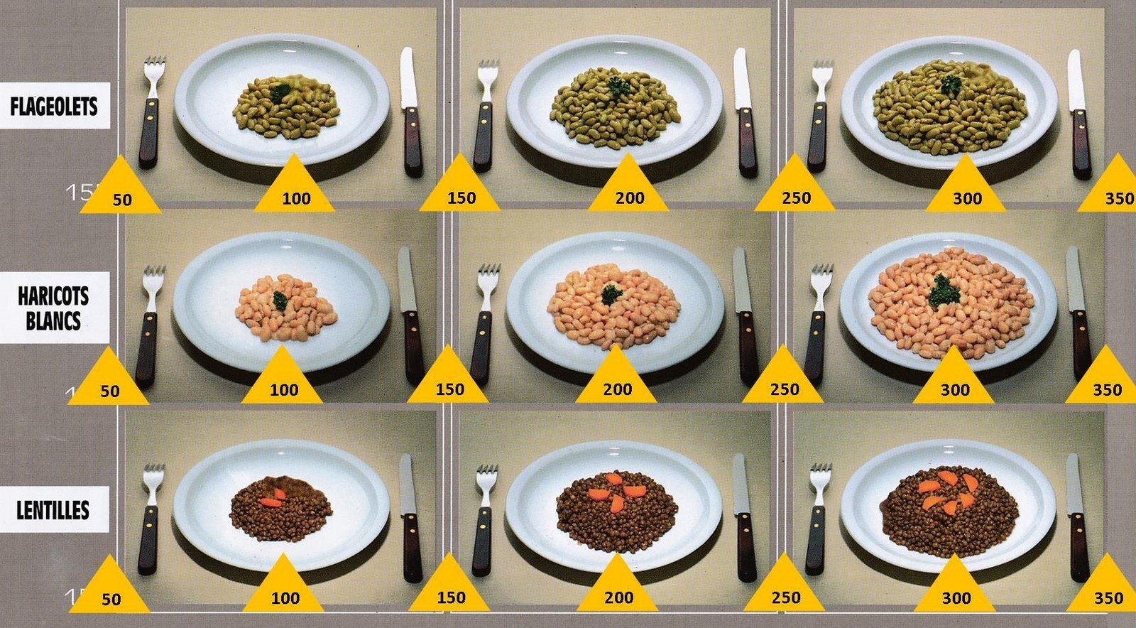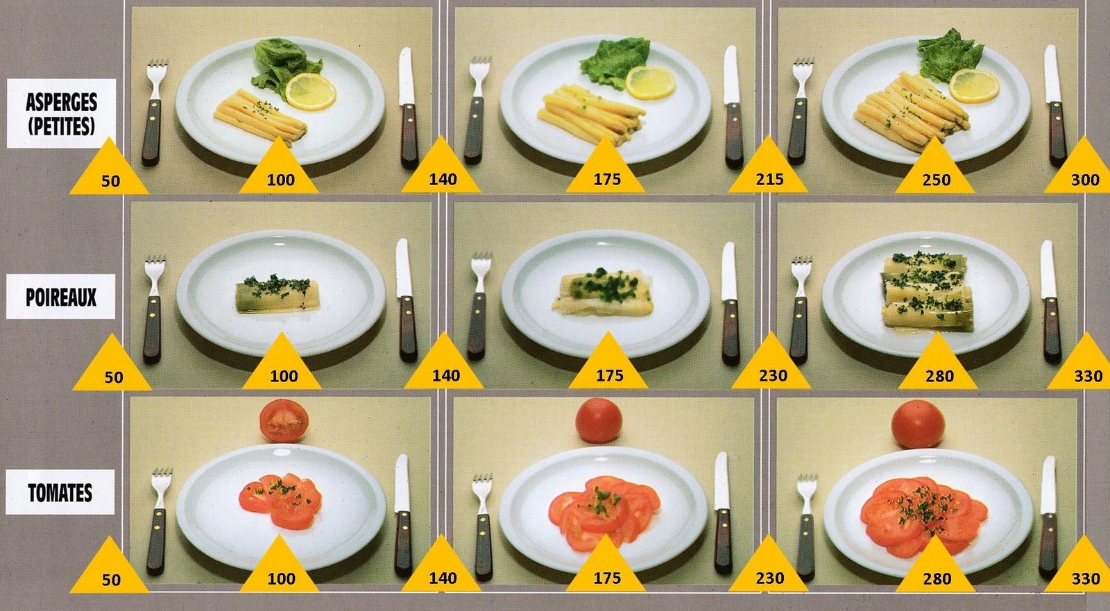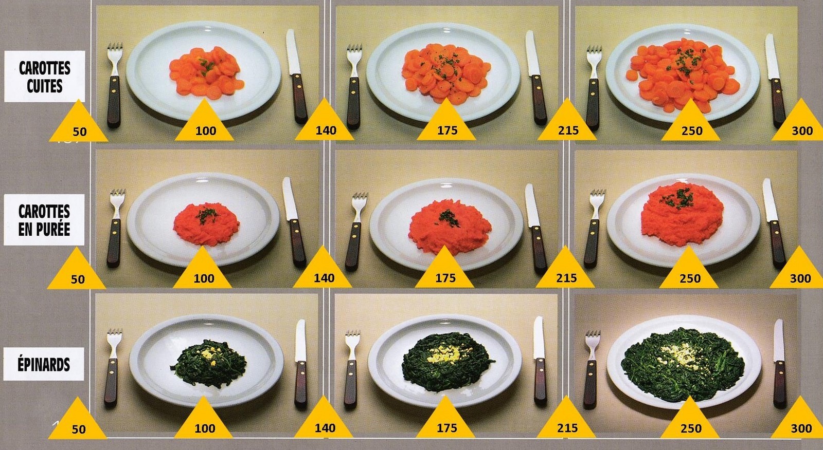 Le poids des aliments est noté dans les triangles jaunes, en grammes pour les aliments solides,