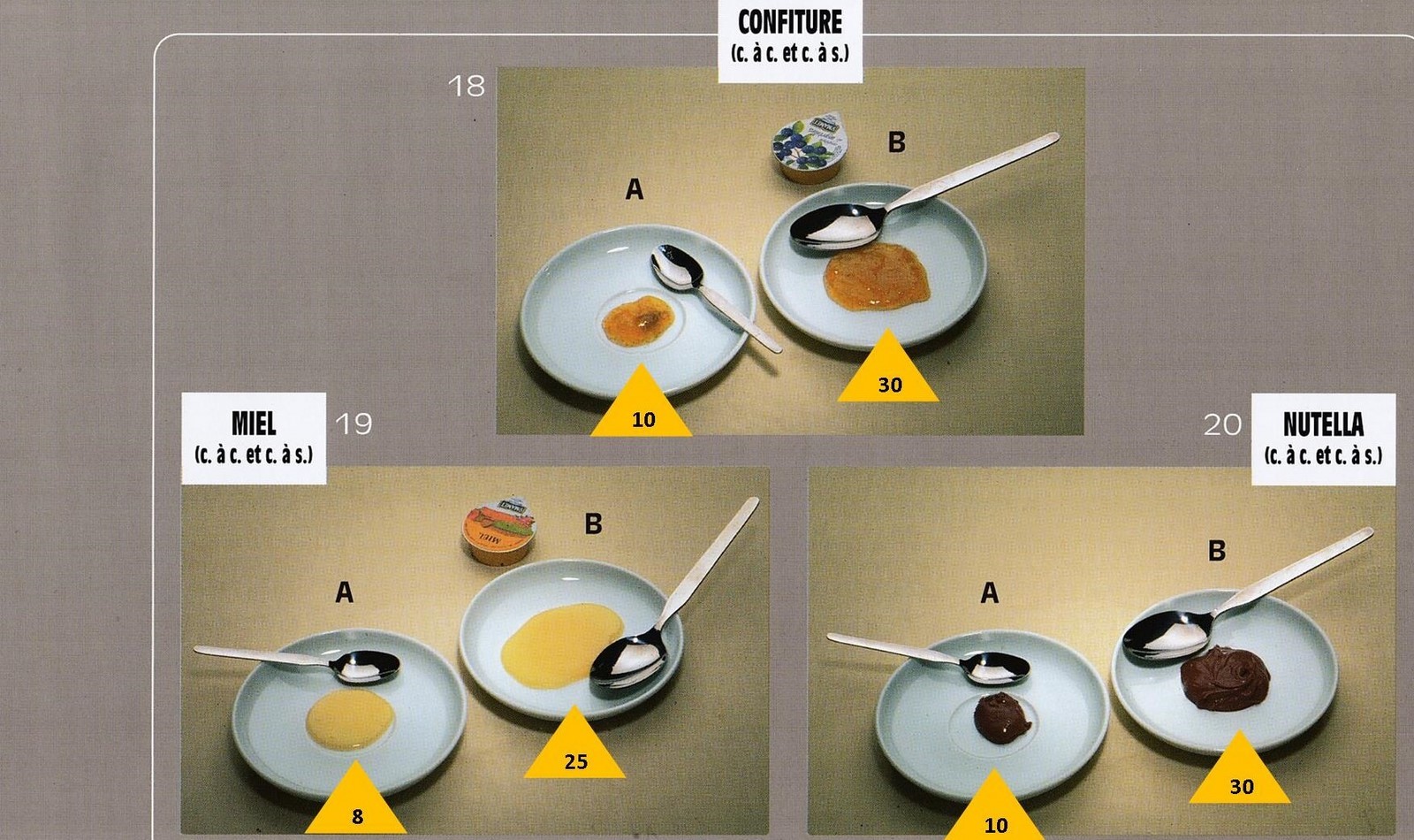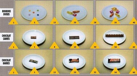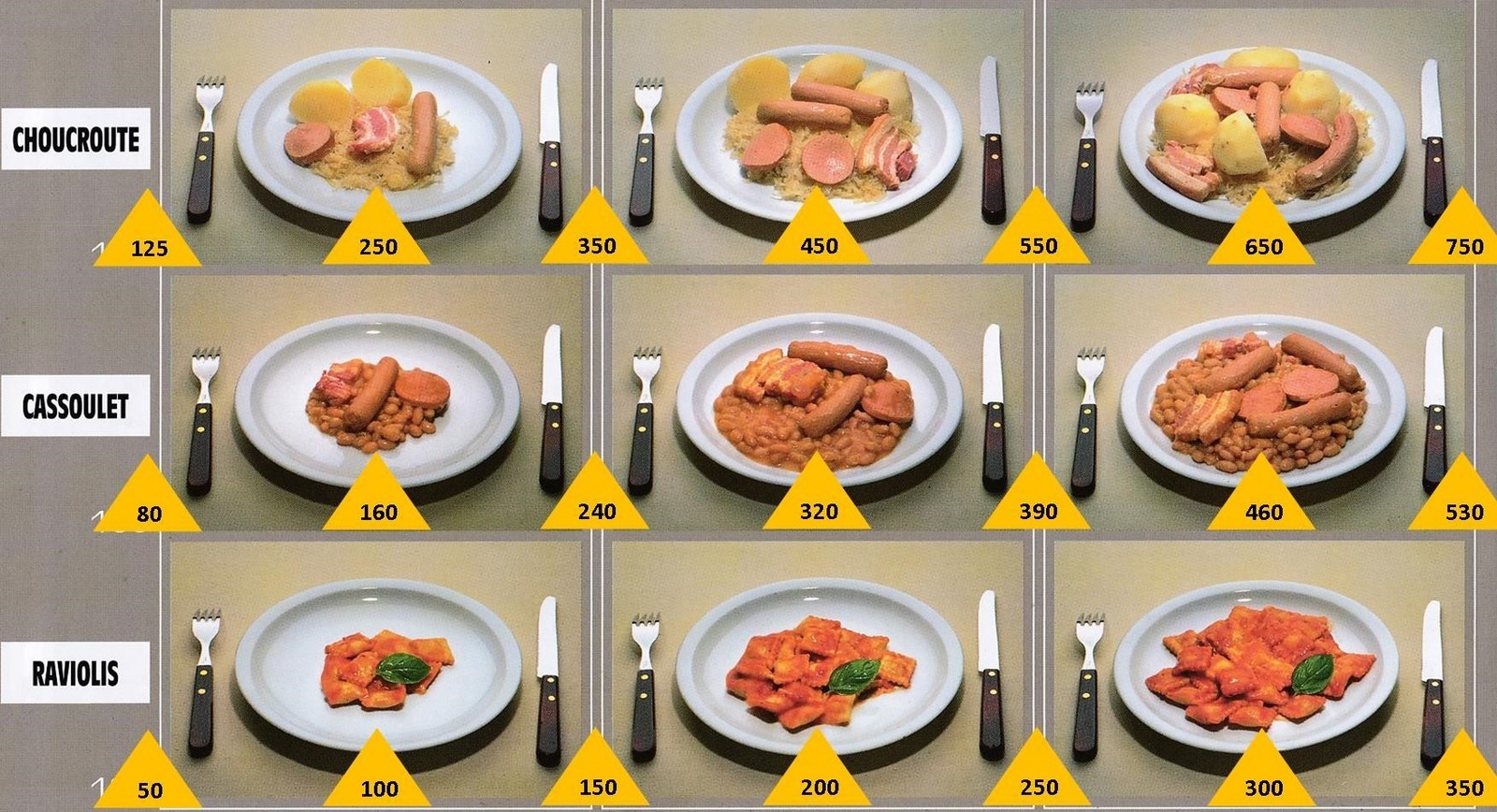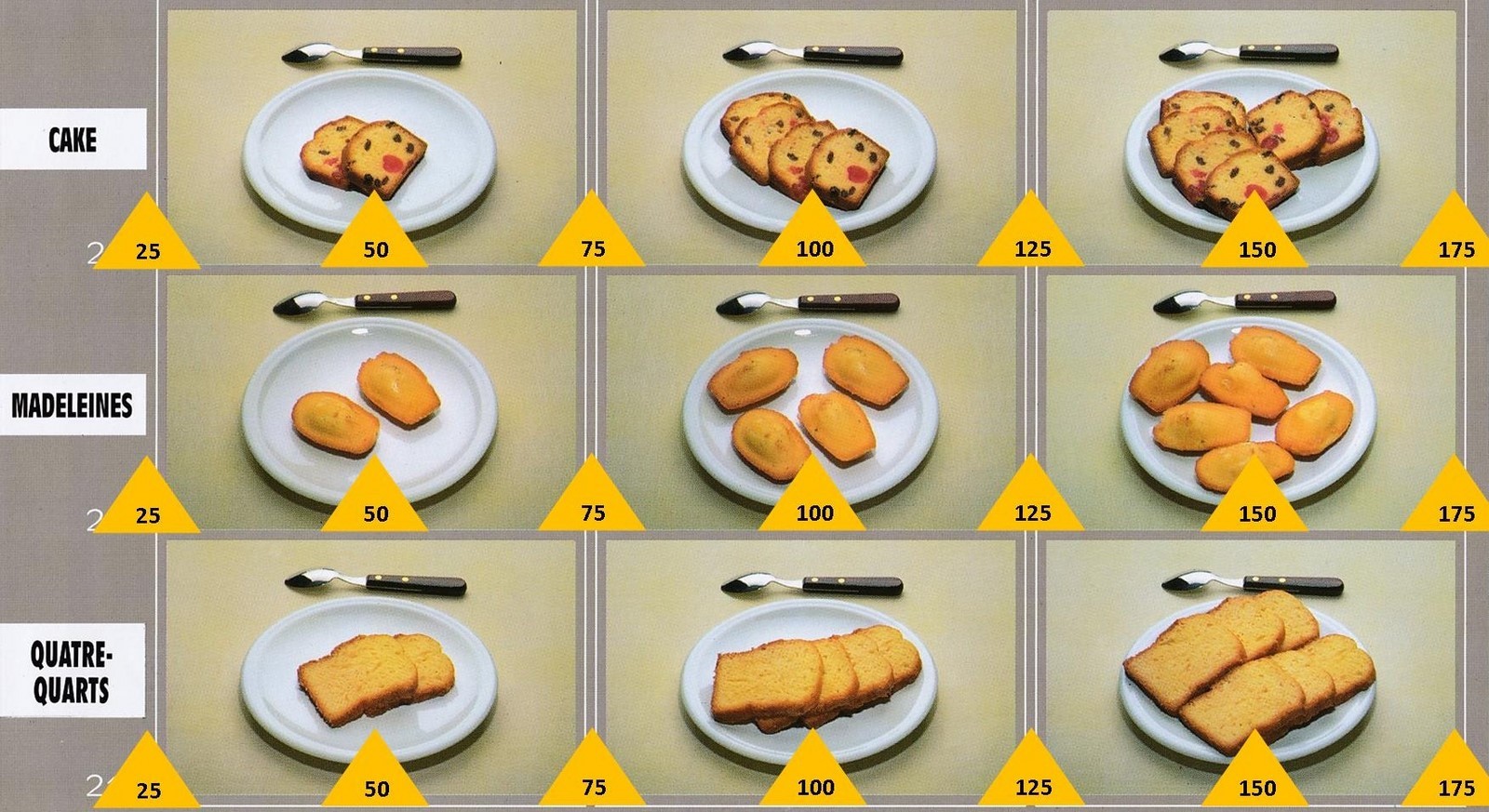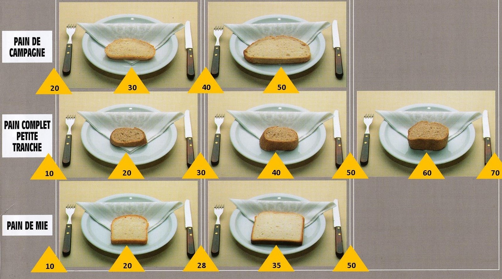 Le poids des aliments est noté dans les triangles jaunes, en grammes pour les aliments solides,