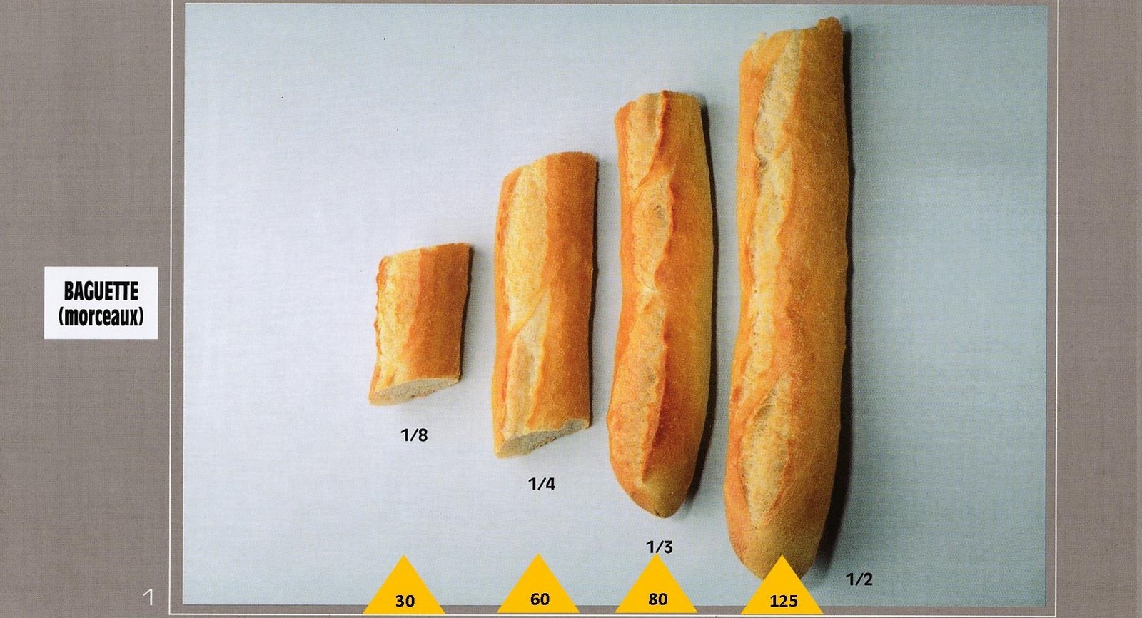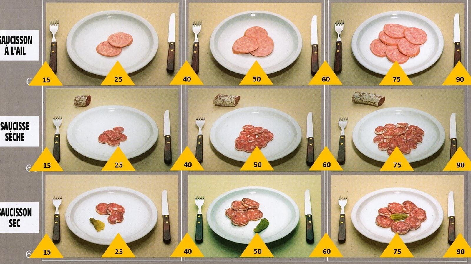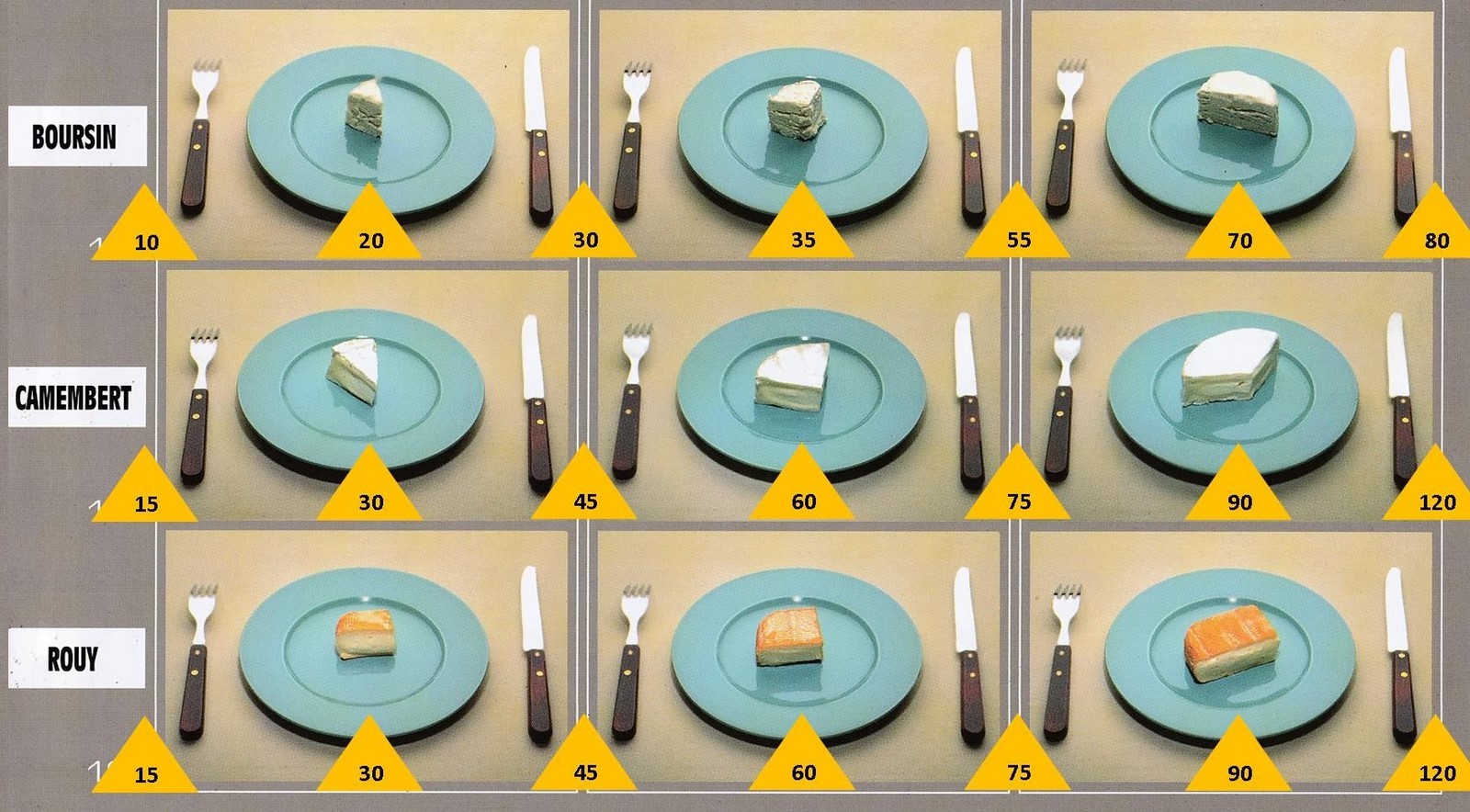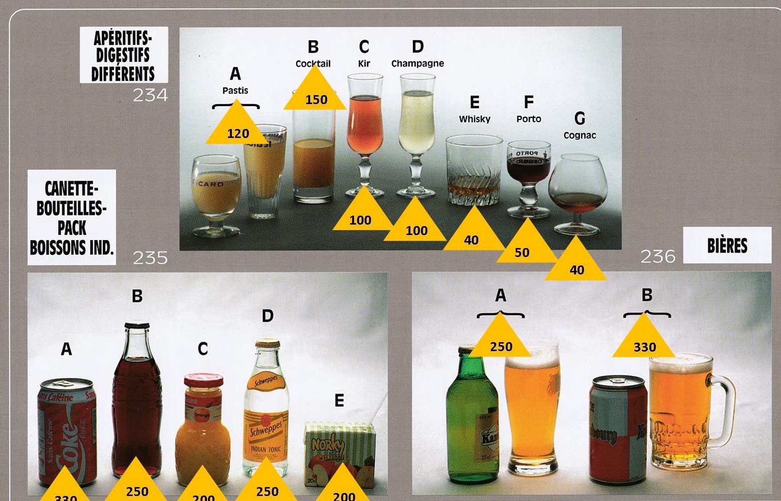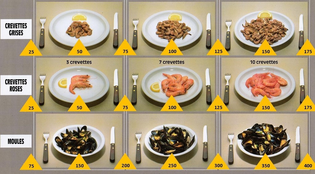 Le poids des aliments est noté dans les triangles jaunes, en grammes pour les aliments solides,