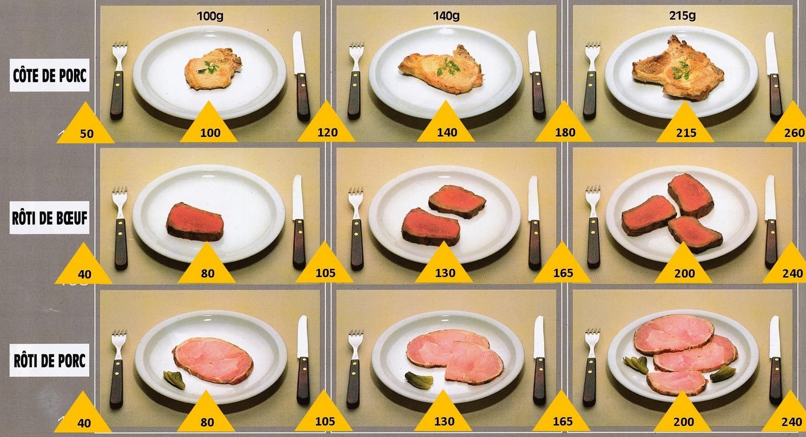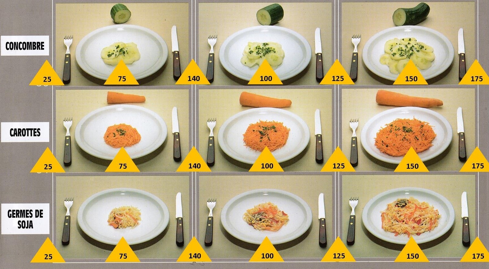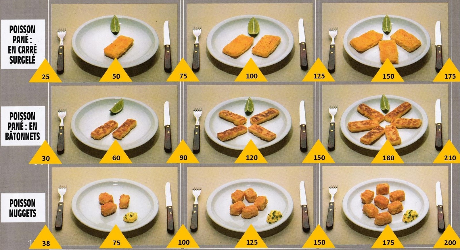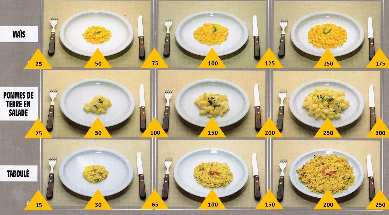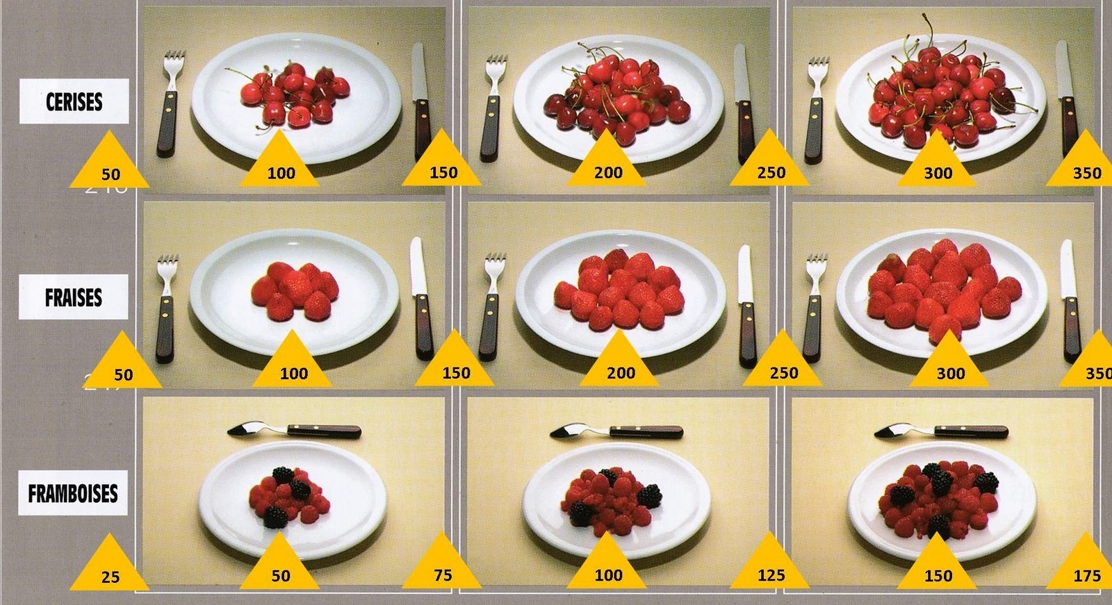 Le poids des aliments est noté dans les triangles jaunes, en grammes pour les aliments solides,