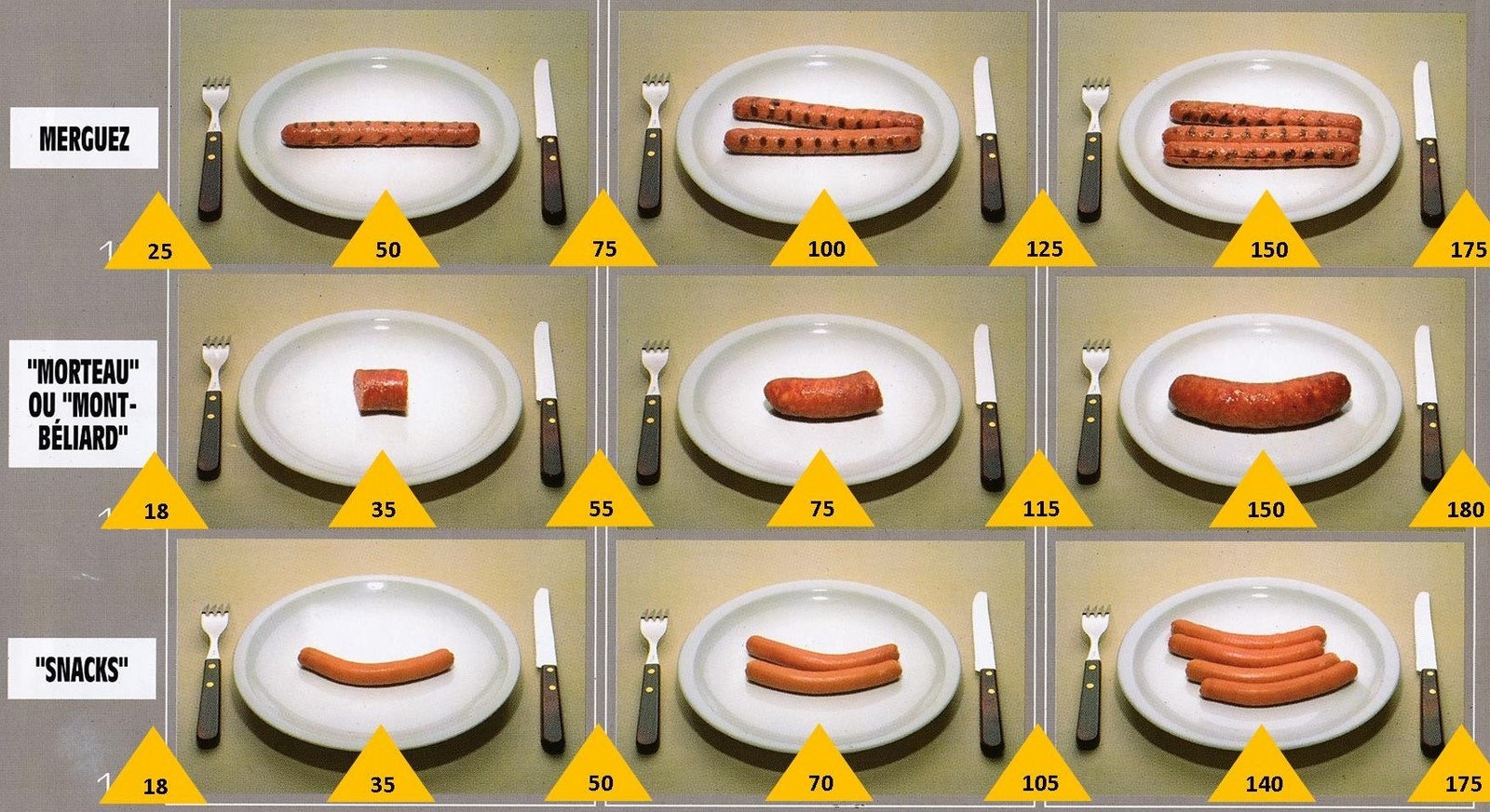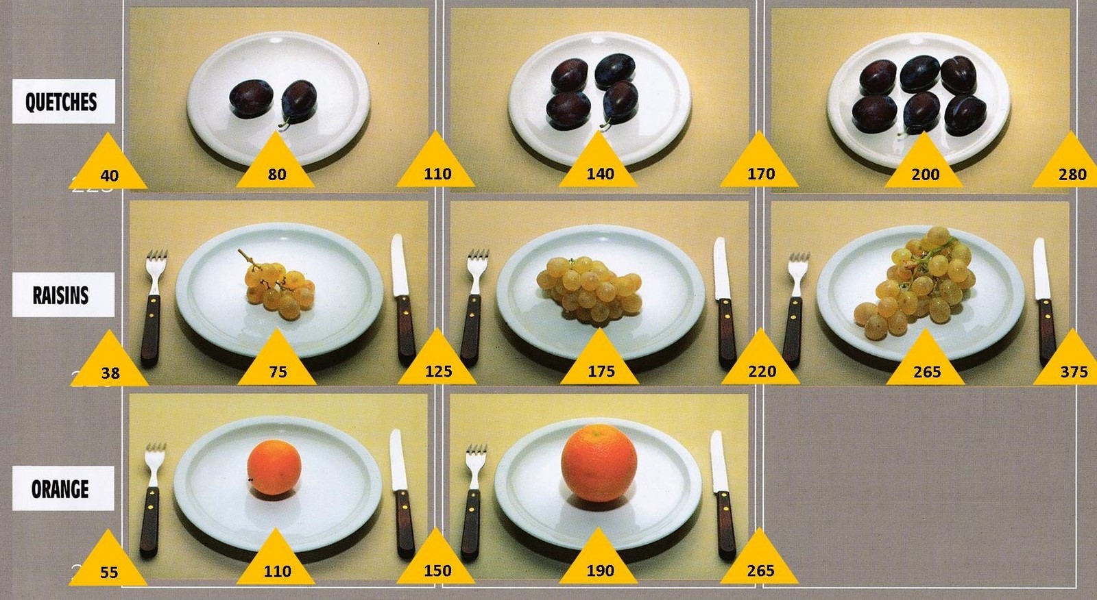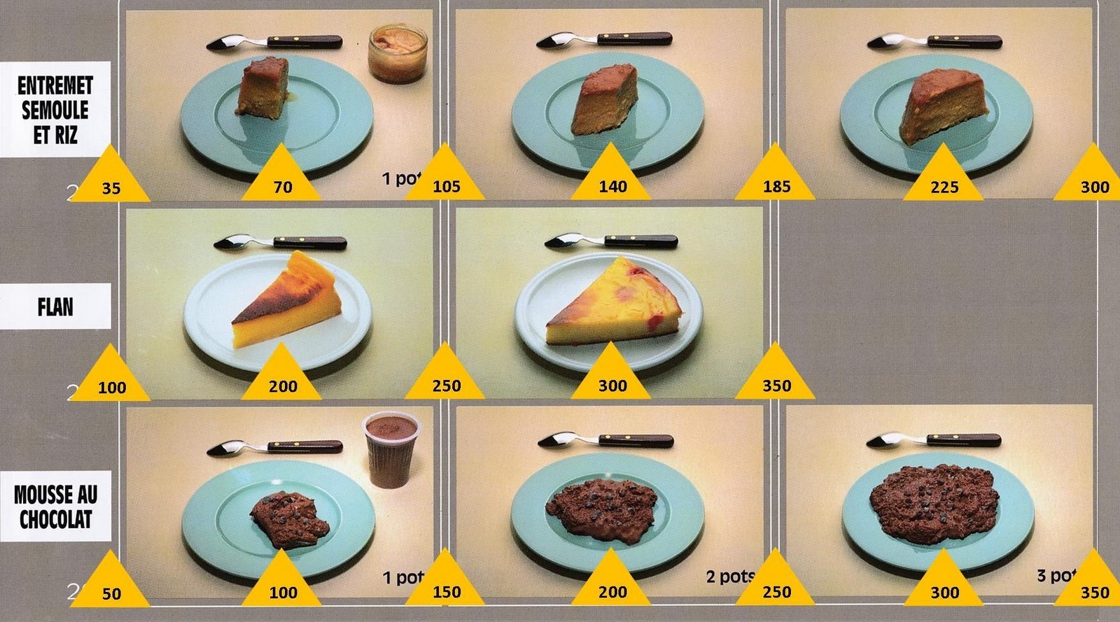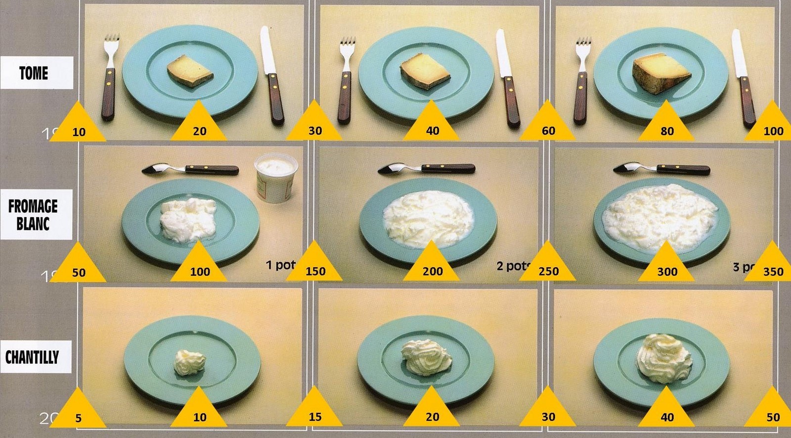 Le poids des aliments est noté dans les triangles jaunes, en grammes pour les aliments solides,