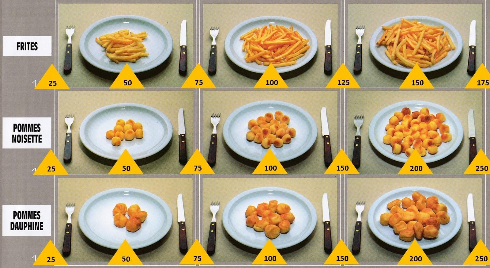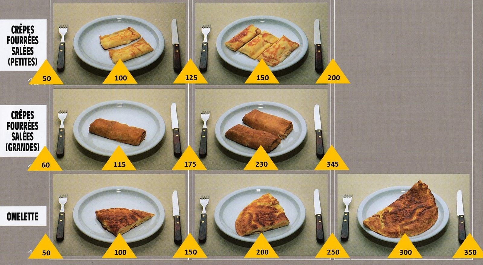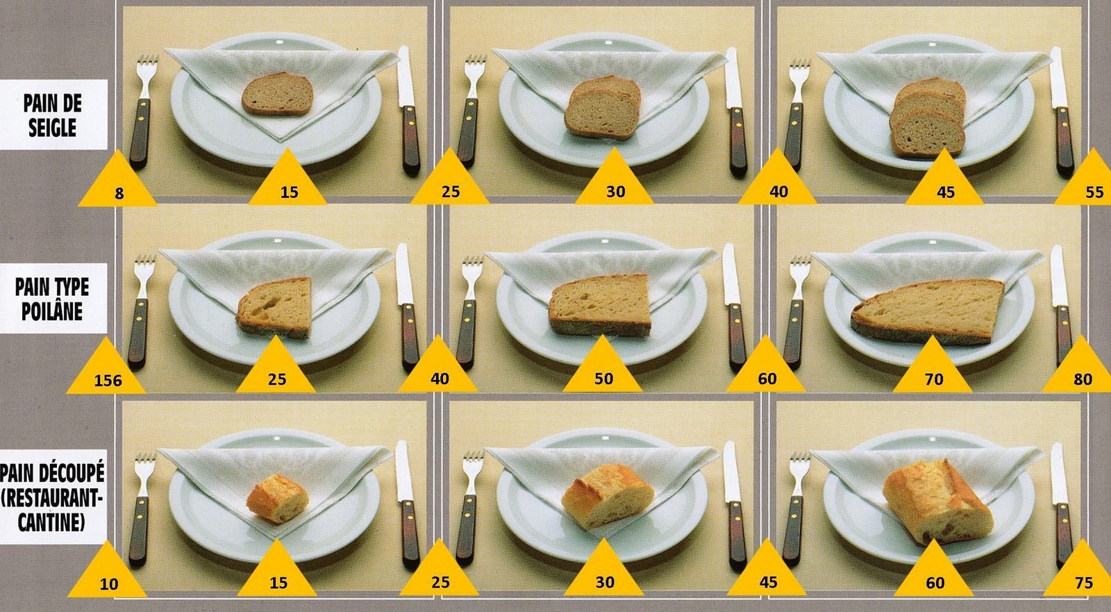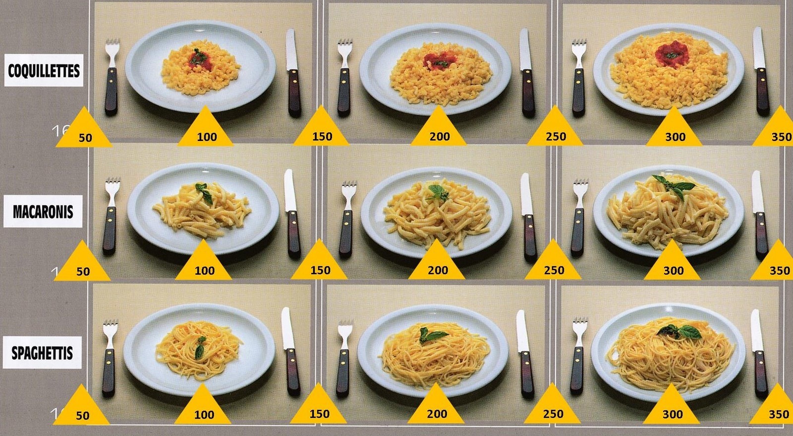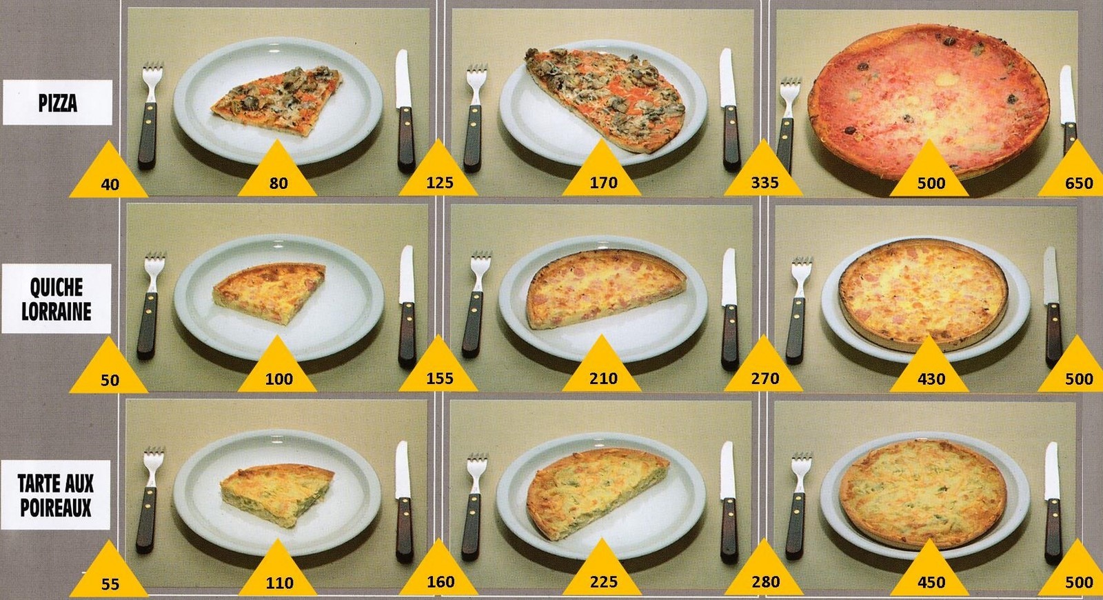 Le poids des aliments est noté dans les triangles jaunes, en grammes pour les aliments solides,