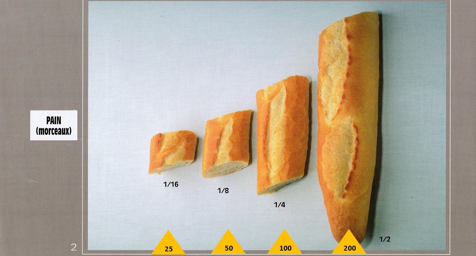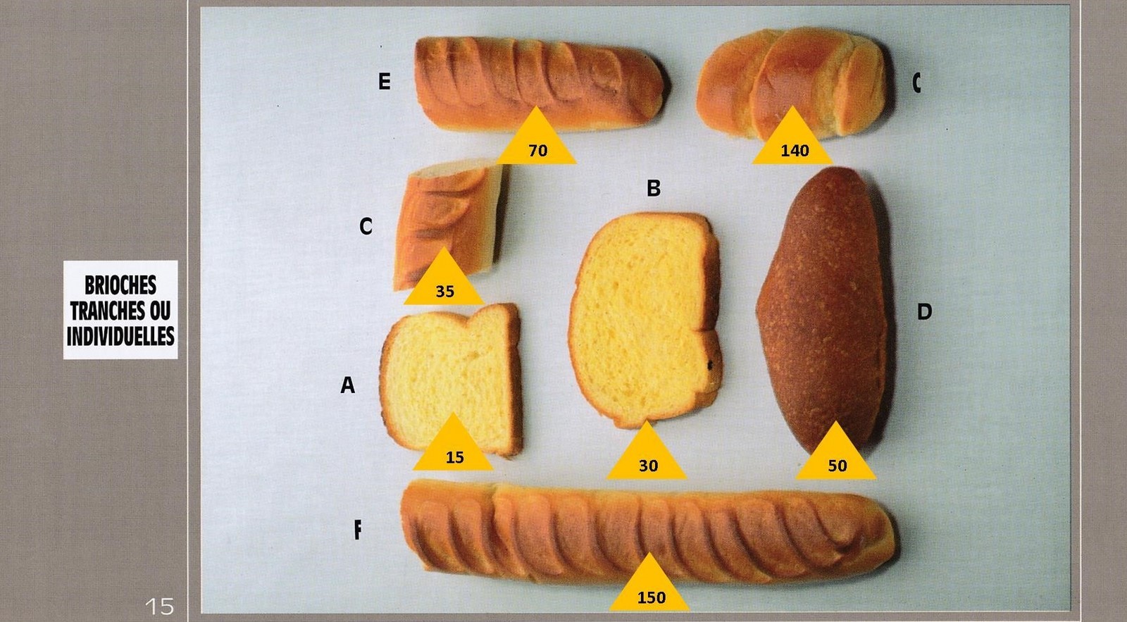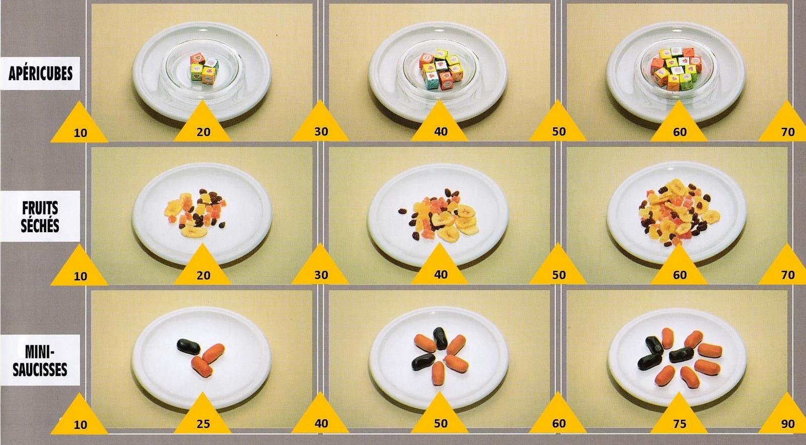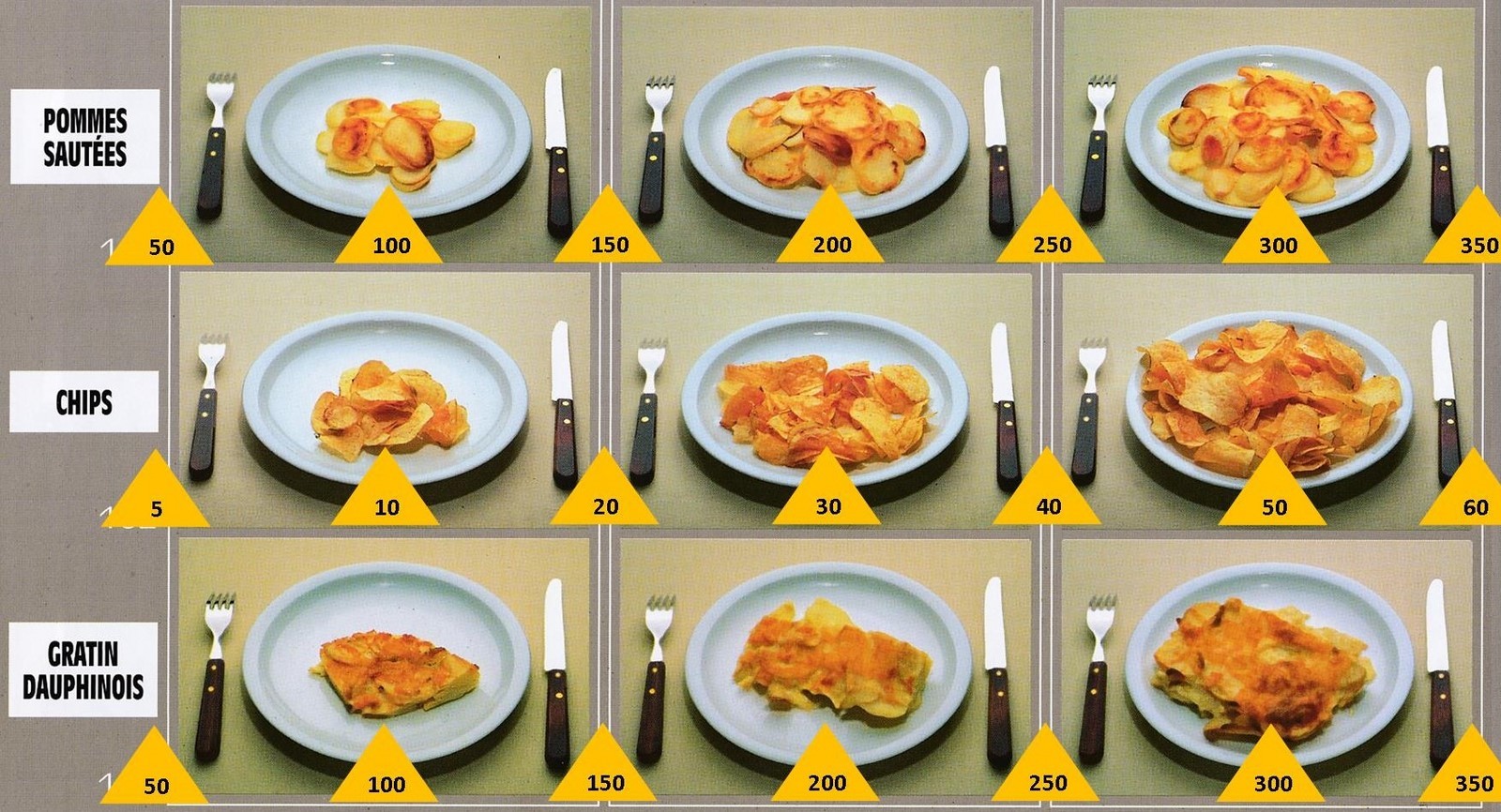Le poids des aliments est noté dans les triangles jaunes, en grammes pour les aliments solides,