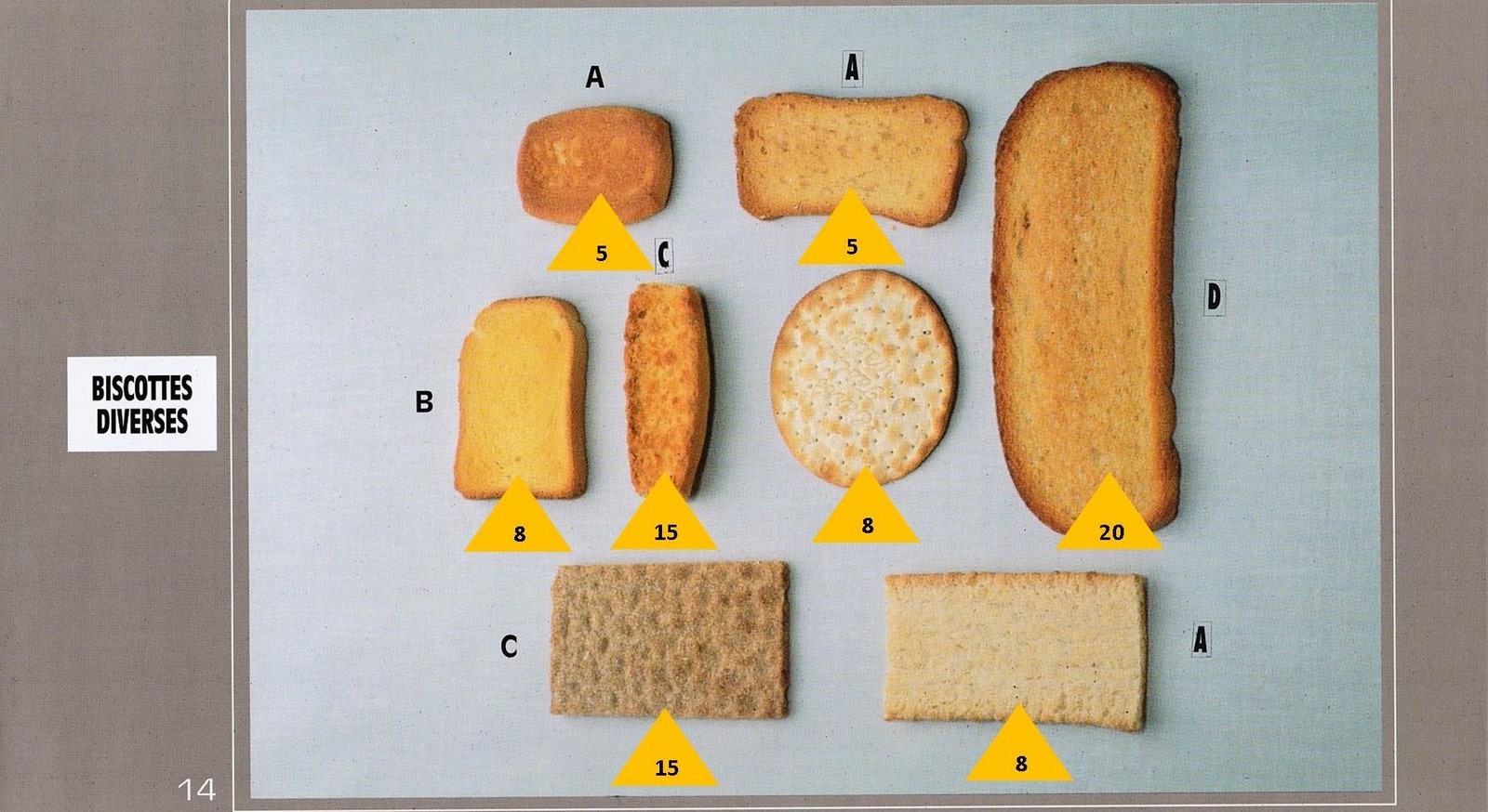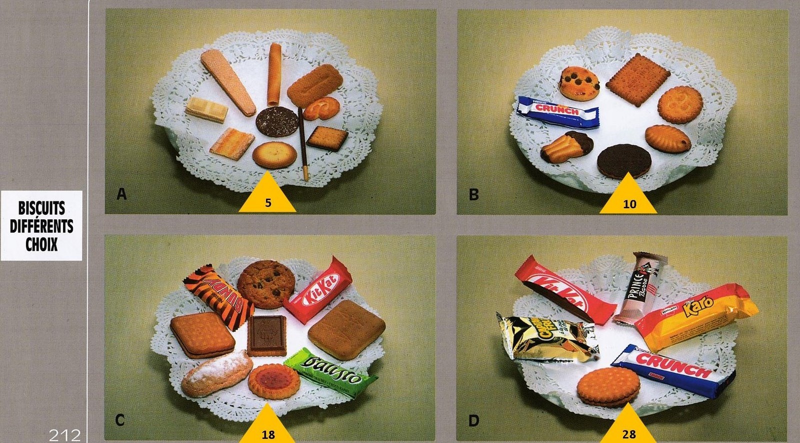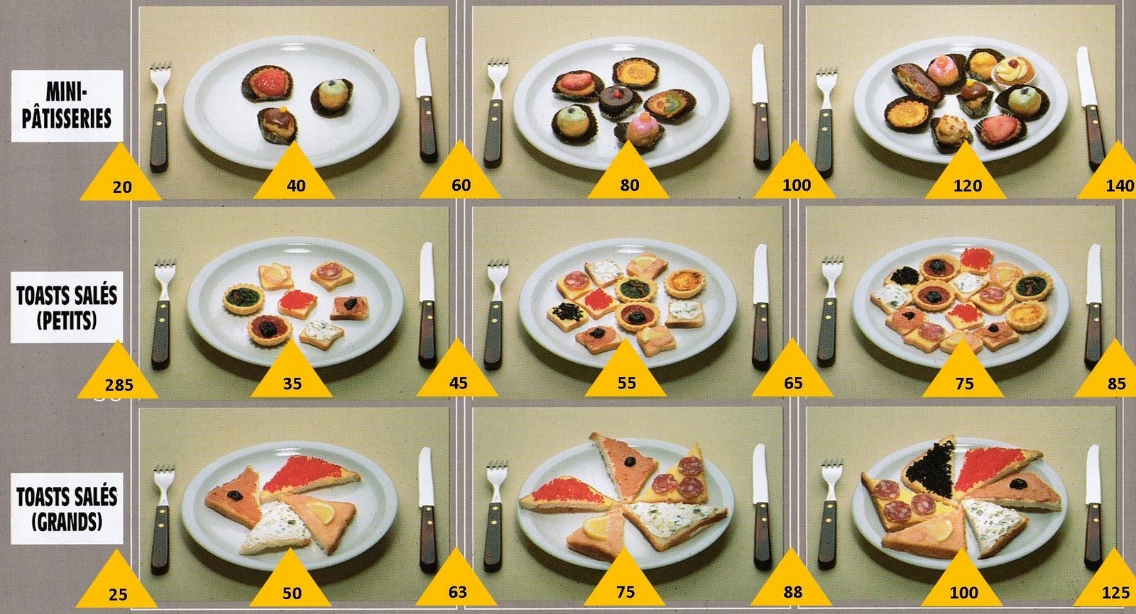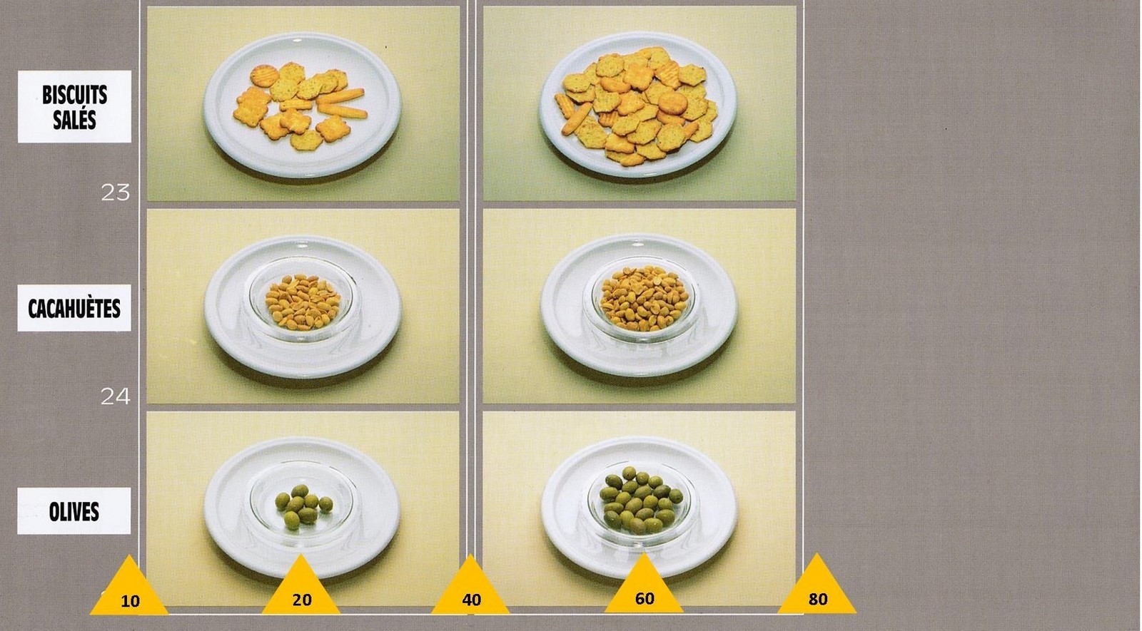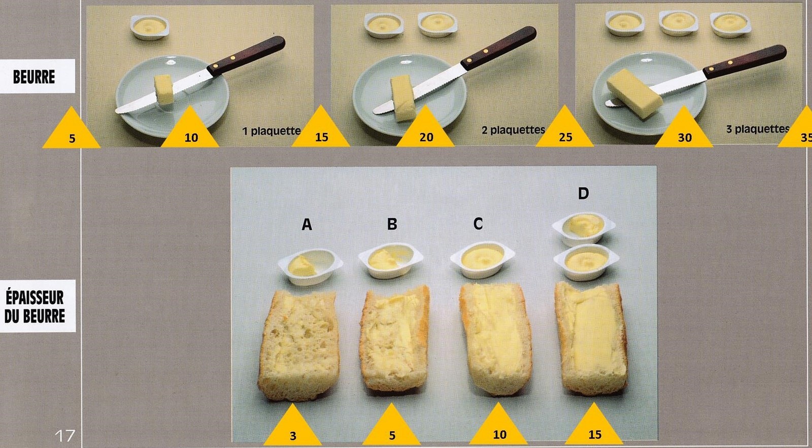 Le poids des aliments est noté dans les triangles jaunes, en grammes pour les aliments solides,
